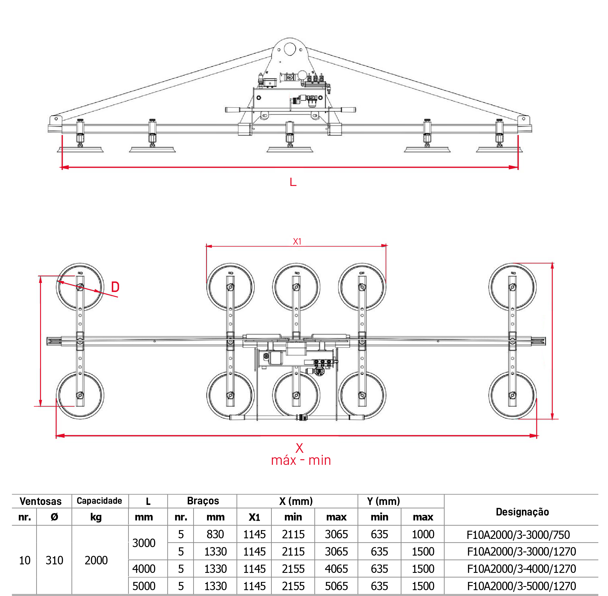 A ventosa pneumática de elevação F10A foi projetada para proporcionar máxima eficiência e segurança no manuseamento de chapas metálicas. Possui dez ventosas em borracha vulcanizada, montadas numa trave transversal, permitindo o reposicionamento das ventosas ao longo da estrutura e oferecendo flexibilidade total para chapas de diferentes dimensões. Com uma capacidade máxima de elevação de 2000 kg, o ajuste preciso das posições das ventosas e dos braços, aliado à possibilidade de utilizar apenas ventosas específicas, assegura a adaptação perfeita da operação às exigências de cada carga.
